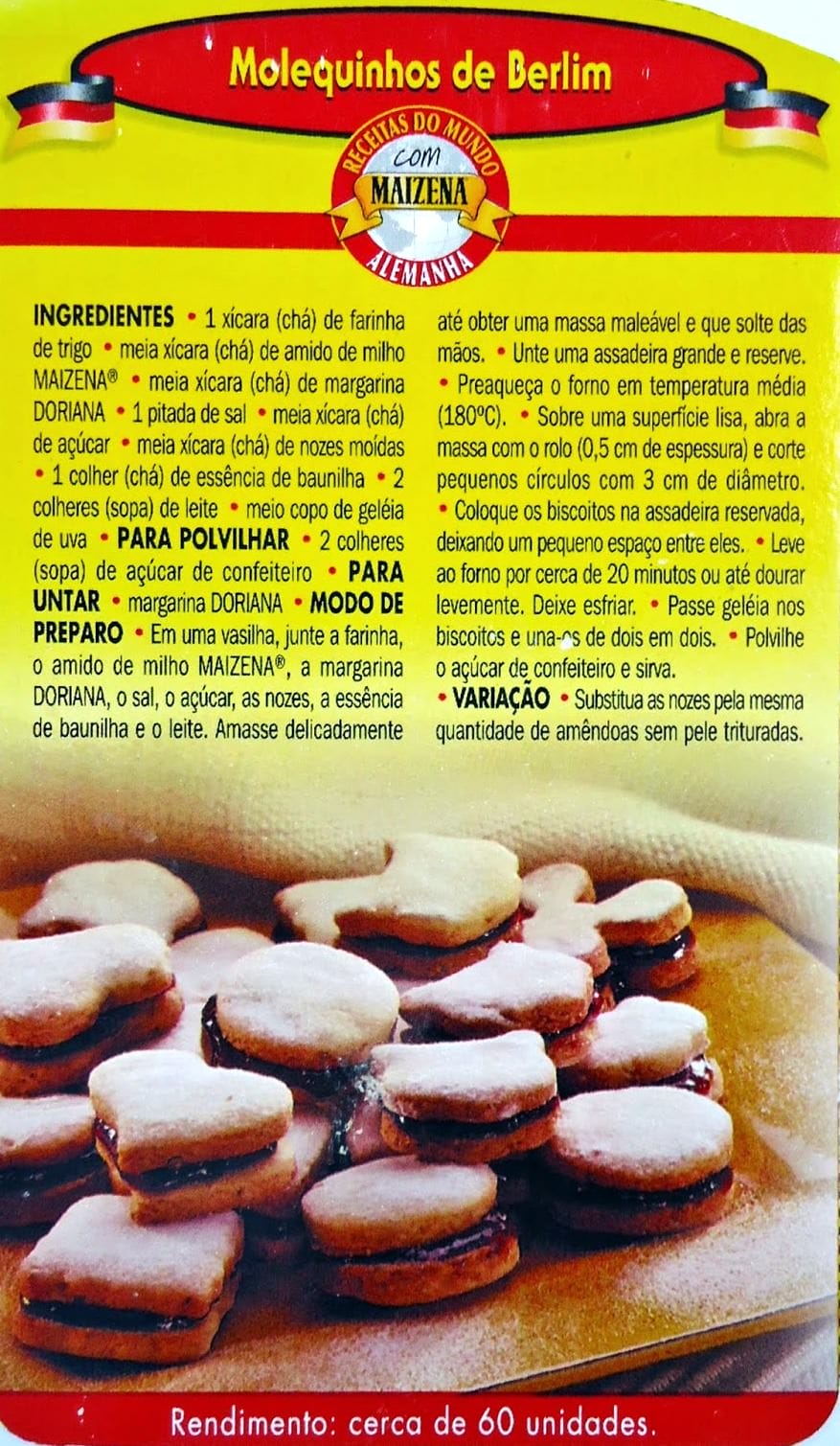 Os Molequinhos de Berlim são delicados e crocantes biscoitos de influência alemã, que se destacam pelo seu tamanho diminuto e formatos atrativos. Tradicionalmente, estes pequenos doces são moldados em formas circulares, de coração ou outros desenhos decorativos, e posteriormente preenchidos com geleias ou chocolate, antes de serem polvilhados com açúcar em pó. Através da migração e intercâmbio cultural, essa tradição chegou ao Brasil, onde os Molequinhos de Berlim se tornaram uma apreciada iguaria regional.